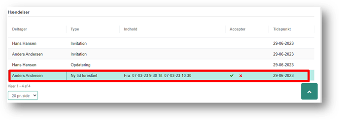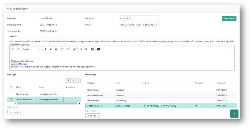 Hvis en deltager foreslår et nyt tidspunkt, i den modtagne indkaldelse, er det muligt at acceptere denne ændring, hvorefter DUBU ændrer mødetidspunktet, og sender en opdateret indkaldelse til mødedeltagere. Det er muligt at følge hændelser, og acceptere evt. forslag til ændret mødetidspunkt, under hændelser.