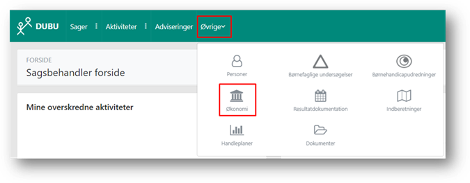 Overblikket over økonomi på tværs af sager kan du få fra økonomisiden, som du åbner via navigationsbjælken – Øvrige – Økonomi.