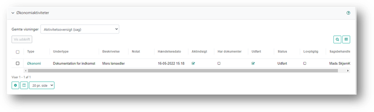 For at opnå ovenstående begrænsning af aktiviteter, skal du have tildelt brugersystemrollen: Økonomi.Aktivitet.Læs. Hvis du også skal have adgang til ydelser på en sag, skal du have brugersystemrollen: Ydelse.Læs. Kontakt evt. din superbruger for tildeling.