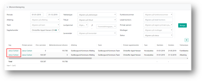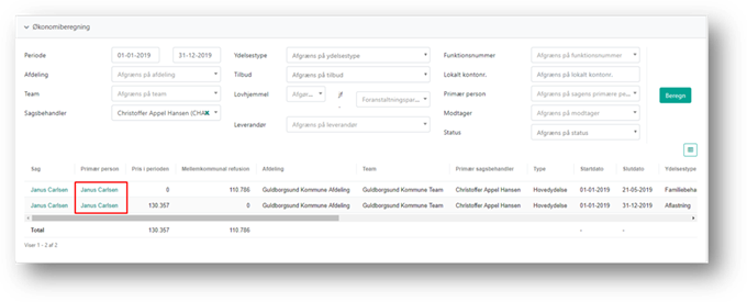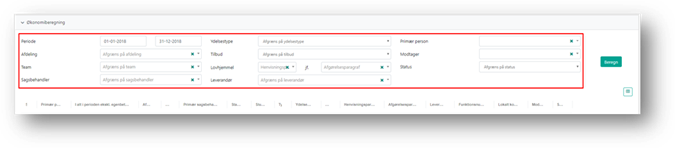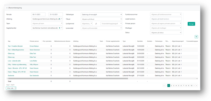 Når beregningen er gennemført, vises listen under afgrænsningsfelterne med de ydelser der falder indenfor afgrænsningen og den valgte periode. Hvis en ydelse har en start- og stopdato, uden for den fremsøgte periode, vises kun de udgifter, der ligger i den fremsøgte periode. Hvis resultaterne indeholder mange resultater, vil du kunne bladre mellem resultaterne via knapperne under listen, samt vælge antal resultater pr. side.