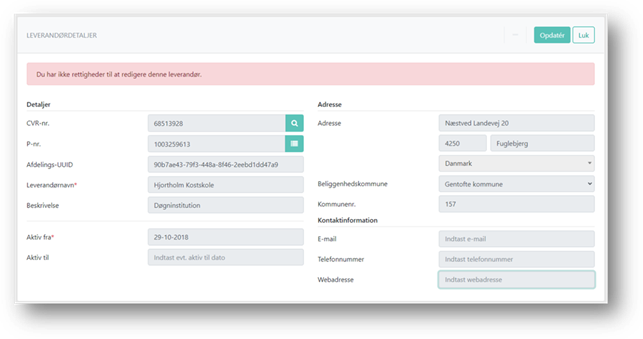 På leverandørdetaljesiden kan du se alle de oplysninger der er registreret om en given leverandør. Det er dog ikke muligt for dig at foretage ændringer i leverandørens oplysninger. Hvis du opdager noget som bør ændres, så kontakt din lokale superbruger.