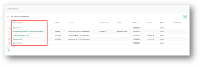Som udgangspunkt vises kun leverandører, der kan vælges som leverandører på en ydelse enten nu eller i fremtiden. Hvis du også ønsker at se leverandører som ikke længere kan vælges, skal du markere tjekboksen Vis historiske leverandører.