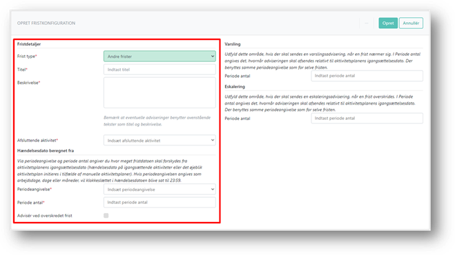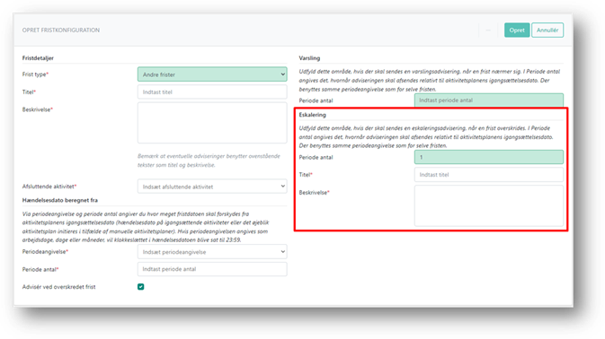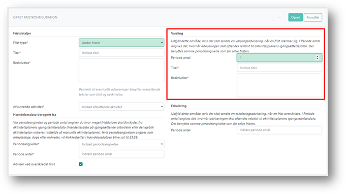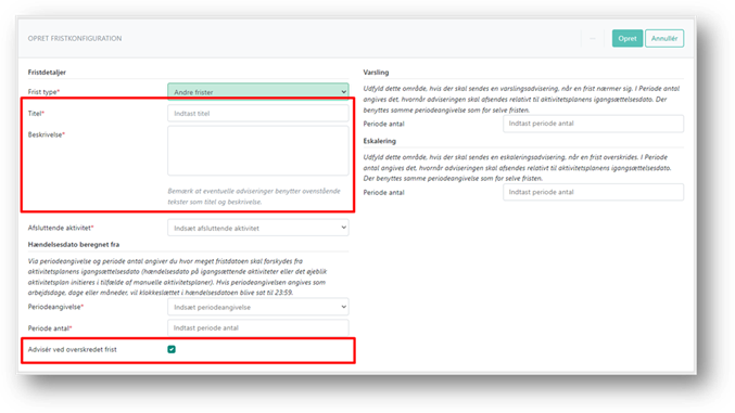 Du har også mulighed for at vælge om der skal oprettes en advisering ved fristoverskridelse. Adviseringen vil i givet fald have samme titel og beskrivelse som fristen.