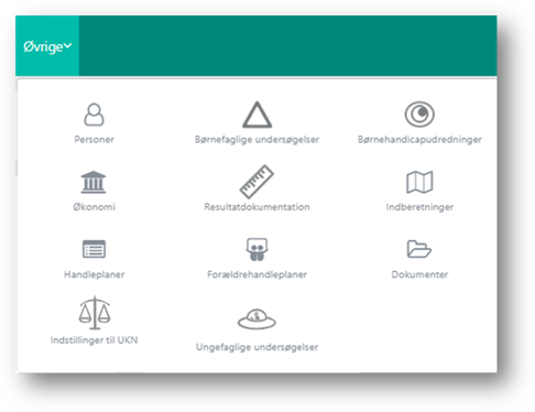 Ved klik på menuen ’Øvrige’ åbnes en boks, hvor du kan se og klikke på en række menupunkter for at åbne disse sider. Hvad du kan se i menupunktet ’Øvrige’ afhænger af dine rettigheder. Hvert enkelte menupunkt, kræver en særlig rettighed for at kunne se dem. Der er vist et eksempel på ’Øvrige’- menuen på nedenstående skærmbillede, hvor brugeren har alle rettigheder.