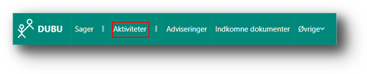 Menuen ’Aktiviteter’ findes øverst, ved siden af ’Sager’ i skærmbilledet. Du kan åbne menuen ’Aktiviteter’ uanset hvor du er i DUBU.