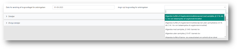Når lovgrundlaget for en anbringelse ændres fx fra tvang til frivillig, fra en forvaltningsafgørelse til afgørelse truffet af Ungdomskriminalitetsnævnet eller når der fortages anden ændring i anbringelsesgrundlaget i forbindelse med en dom, skal du benytte aktiviteten 'Afgørelse – Ændret lovgrundlag for anbringelse'. Aktiviteten indeholder to specialfelter, hvor du skal angive datoen for ændringen samt angive det nye lovgrundlag.