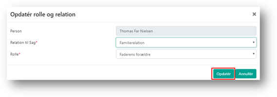 Hvis en person i Barnets netværk skifter rolle, er det muligt at lave ændringen fra listen over personer i netværket. Du ændrer en persons rolle og relation i barnets netværk ved at klikke felterne ’Relation til sag’ eller ’Rolle’ for den person, hvor der skal foretages en ændring. Det er nu muligt at vælge imellem de samme relationer og roller som ved oprettelse af en person.