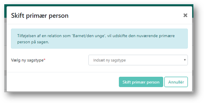 Når du vælger Relation til sag og Rolle til Primær person udvides boksen med et felt, hvor du kan angive hvilken sagstype sagen skal have fremadrettet.