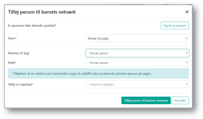 Er barnet allerede oprettet tilføjer du barnet til barnets netværk på sagen som beskrevet i afsnit Personoprettelse via barnets netværk og vælger primær person ved Relation til sag og Rolle.