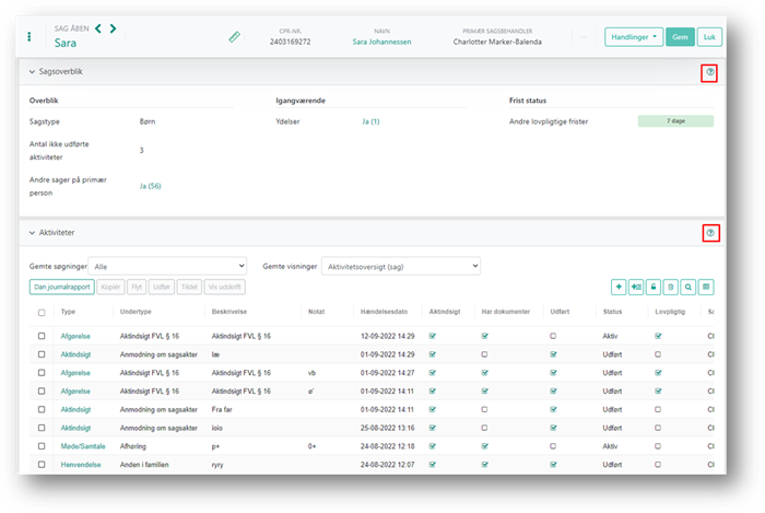 Udover at kunne åbne Onlinehjælpen via navigationsbjælken, vil du forskellige steder i DUBU, kunne åbne specifikke områder af Onlinehjælpen, fx på Sagens faner.