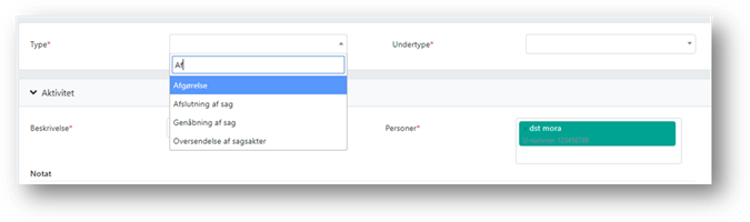 Du skal vælge en type og undertype for at oprette en aktivitet. Typer og undertyper er faste værdier, der angiver hvilken hændelse på sagen, du er ved at journalisere, f.eks. en underretning, en afgørelse, et møde, en mødeindkaldelse eller lignende. Du kan i Informationscentret finde en oversigt over aktivitetstyper og -undertyper med angivelse af anvendelse. Du skal vælge ’Type’, før du kan vælge den relevante ’Undertype’, da de mulige valg i ’Undertype’ er afhængig af valget af ’Type’.
