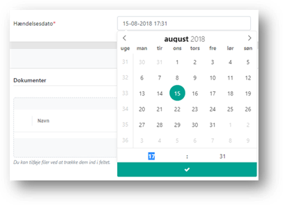 Du skal herefter udfylde feltet ’Hændelsesdato’ med den dato og klokkeslæt, hvor aktiviteten reelt har fundet sted eller med den dato og klokkeslæt, som aktiviteten er planlagt til, hvis den ligger ude i fremtiden.
