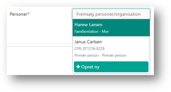 Du har mulighed for at søge allerede oprettede personer (både borgere, professionelle og organisationer) frem i feltet, eller du kan oprette en ny person direkte fra aktiviteten ved at klikke på ’Opret ny’. Når du klikker i feltet ’Personer’ forslås automatisk personer fra Barnets netværk, med angivelse af personens relation til sagen, men andre personer eller organisationer kan også fremsøges.