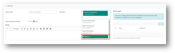 I feltet ’Personer’ har du mulighed for at angive, hvem aktiviteten omhandler. ’Personer’ er automatisk sat til den primære person på sagen, men du har mulighed for at vælge en anden person, som er relevant for aktiviteten, fx mor eller far, som modtager af et brev. Det er også muligt at tilføje flere personer til aktiviteten. Dette kan fx benyttes, hvis du skal registrere mødedeltagere på en mødeaktivitet.