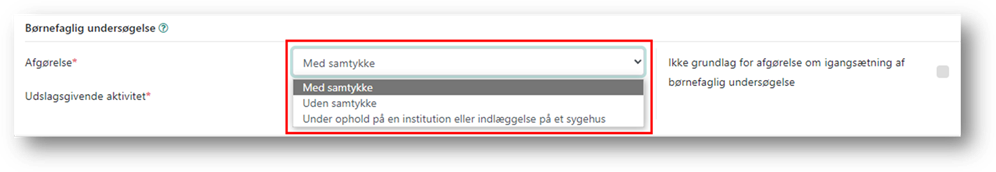 Du skal endvidere angive om afgørelsen er truffet med eller uden samtykke, eller om der er truffet afgørelse om gennemførelse af børnefaglig undersøgelse under ophold på en institution eller indlæggelse på et sygehus. Dette vil ligeledes overført til den børnefaglige undersøgelse under fanen ’Baggrund for undersøgelsen’.