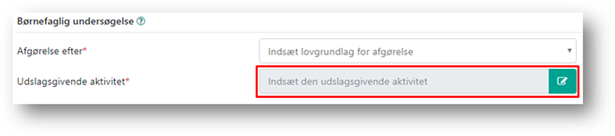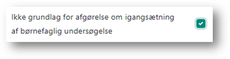 Hvis du skal træffe en afgørelse om, at der ikke er grundlag for en børnefaglig undersøgelse, markeres feltet ”Ikke grundlag for afgørelse om igangsætning af børnefaglig undersøgelse” på aktiviteten ”Afgørelse” – ”Børnefaglig undersøgelse”. Når dette felt markeres, vil der ikke blive oprettet en børnefaglig undersøgelse, når du udfører aktiviteten. Ligeledes skal der ikke tilføjes en udslagsgivende aktivitet, som ved oprettelse af børnefaglig undersøgelse.