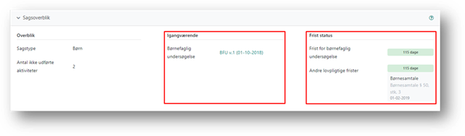 Den aktive Børnefaglig undersøgelse samt fristen for denne, vises på sagsoverblikket. Du kan åbne den børnefaglig undersøgelse fra overblikket ved at klikke på linket for Børnefaglig Undersøgelse eller ved at klikke på fristen for den børnefaglige undersøgelse.