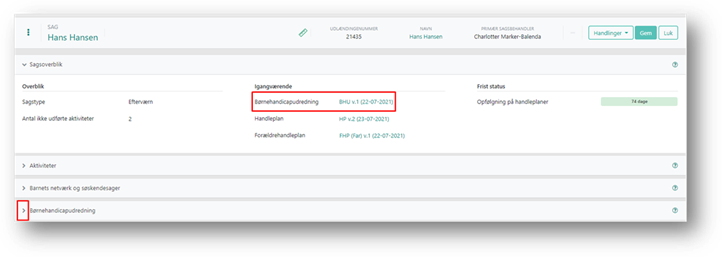 Når du udfører aktiviteten, bliver børnehandicapudredningen oprettet på sagen. Børnehandicapudredningen vises på Sagsoverblikket og på fanen Børnehandicapudredning, og kan åbnes ved at klikke på titlen.
