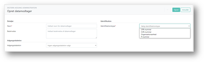 Bemærk! Feltet Identifikationstype kan ikke redigeres efter oprettelsen. Du skal derfor være opmærksom på, at CPR, CVR, Organisationsenhed eller P-nummer er korrekt, inden du opretter en datamodtager.
