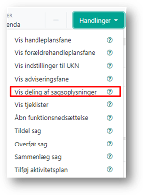 Første gang du skal oprette en deling af sagsoplysninger med en datamodtager, skal du klikke i menuen Handlinger på sagen, og vælge Vis deling af sagsoplysninger.