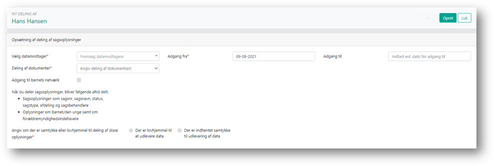 Når du deler sagsoplysninger med en datamodtager, giver du adgang til oplysninger om sagen.