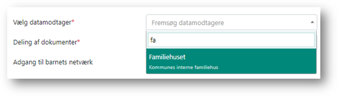 Du skal vælge blandt de datamodtagere, der er oprettet i kommunen. Feltet består af navnet, samt en beskrivelse nedenunder, der hjælper dig til at vælge den rigtige datamodtager.