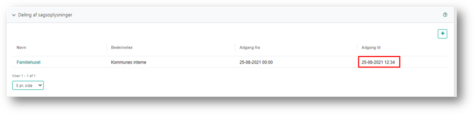 Hvis din superbruger/administrator sletter en datamodtager som du deler oplysninger med, vil der adgangen blive afsluttet på det tidspunkt datamodtageren er slettet, og du vil kunne se dato og klokkeslæt for ophør af delingen på forsiden under Deling af sagsoplysninger.