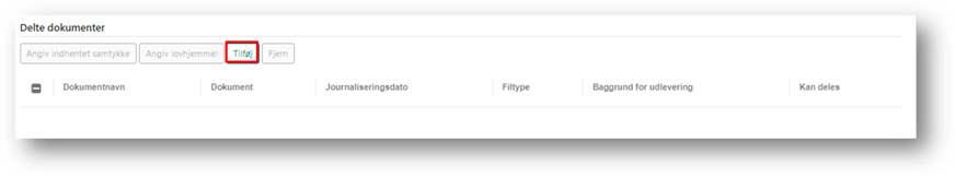Du behøver ikke tilføje dokumenter i forbindelse med oprettelse af ny deling. Er der oprettet en deling med deling af udvalgte dokumenter, vil du kunne dele dokumenterne med datamodtageren via dokumentoversigten på aktiviteten. Eller via dette skærmbillede på et senere tidspunkt.