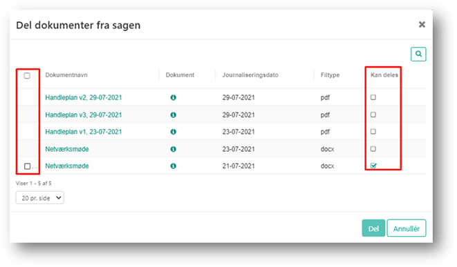 Du får en liste over alle sagens dokumenter på sagen og af kolonnen Kan deles vil det fremgå om dokumenterne kan deles. Det er kun muligt at dele dokumenter fra denne oversigt, hvis dokumentet er tilknyttet en udført aktivitet eller er låst i forbindelse med en forsendelse.