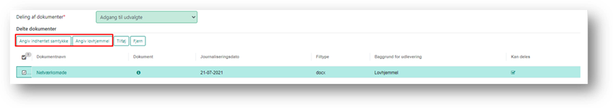 Du angiver dette ved at markere dokumenterne og vælge enten Angiv indhentet samtykke eller Angiv lovhjemmel.