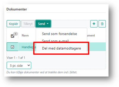 Bemærk! Din kommune kan have opsat begrænsninger for om dokumenter kan deles med en konkret datamodtager. Fx kan man ikke vælge at dele alle dokumenter, hvis din kommune har angivet at man kun må dele udvalgte dokumenter.