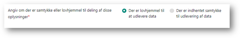 Angiv om der er samtykke eller lovhjemmel til deling af oplysninger