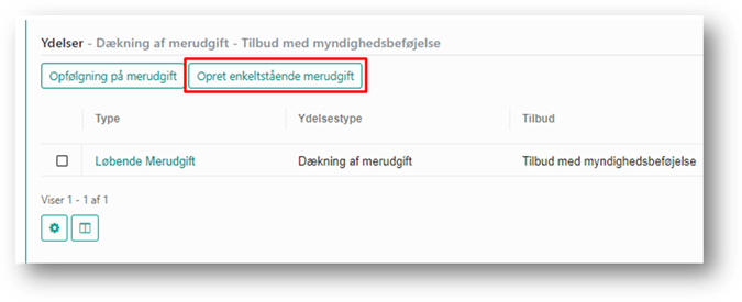 Du opretter en enkeltstående merudgift på en sag, som allerede har en godkendt løbende merudgiftsydelse direkte fra Ydelseslisten. Når du har valgt ydelsen ’Dækning af merudgifter’ i ’Foranstaltning og økonomisk kompensation’ opretter du udgiften via knappen ’Opret enkeltstående merudgift’.