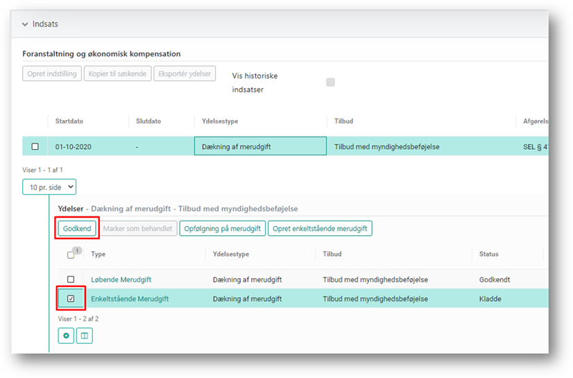 Tilføjer du en enkeltstående merudgift til en eksisterende og godkendt løbende merudgift, godkendes denne ved at markere ydelsen på indsatsfanen på sagen, og vælger godkend, eller ved at ændre status direkte på ydelsen.