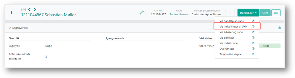 Du tilføjer fanen på sagen ved at klikke på Handlinger i Sagsmenuen og klik på Vis indstillinger til UKN.