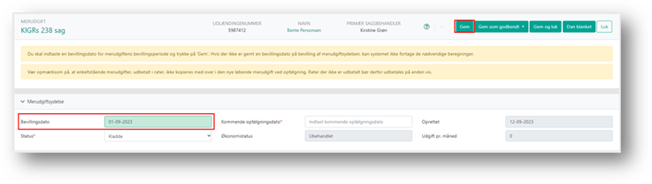 Inden du opretter merudgifter på ydelsen, skal du udfylde ’Bevillingsdato’ og klikke på ’Gem’, for at sikre at DUBU kan beregne udgiften korrekt. ’Bevillingsdato’ er merudgiftsydelsens startdato, og vil typisk være dato for ansøgning om merudgifter, eller datoen for opfølgning på merudgifter.