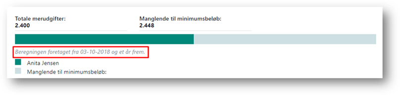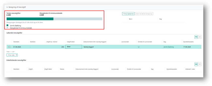 Øverst i fanen ses ’Totale merudgifter’, der er en beregning af alle løbende merudgifter og enkeltstående merudgifter, samt ’ Manglende til minimumsbeløb’, der er en beregning af hvor meget, der mangler for at minimumsbeløbet er nået.