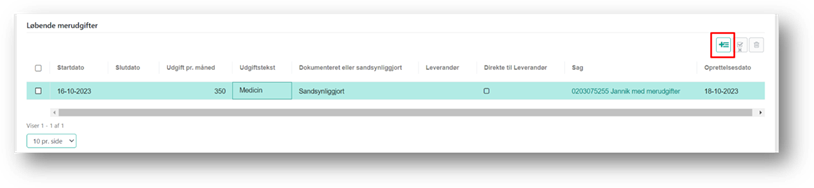 Under fanen ’Beregning af merudgift’ kan du oprette og se de løbende merudgifter og enkeltstående merudgifter, som den løbende merudgiftsydelse består af.