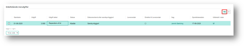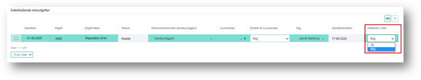Når du opretter en enkeltstående merudgift i forbindelse med løbende merudgifter, der ikke er godkendte, vil den enkeltstående merudgift blive udbetalt i rater. På oprettelseslinjen vil feltet ’Udbetalt i rater’ være markeret. Hvis den enkeltstående merudgift ikke skal udbetales i rater, kan du ændre markeringen i feltet.