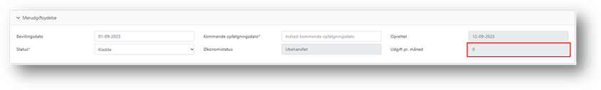 Når du opretter merudgifter under ’Beregning af merudgift’, vil du løbende under ’Merudgiftsydelse’ kunne se beregning af ’Udgift pr. måned’. ’Udgift pr. måned’ viser den gennemsnitlige månedlige udgift for merudgiftsydelsen. Beløbet vil være 0 kr., så længe minimumsbeløbet ikke er nået.