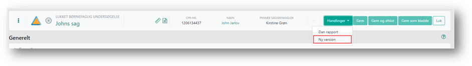 Hvis der tidligere har været udarbejdet en børnefaglig undersøgelse på sagen, og du fx har brug for at udarbejde en ny undersøgelse, men ikke har angivet det i forbindelse med opfølgningen, kan du lave en ny version af undersøgelsen direkte fra den afsluttede undersøgelse. I toppen af den lukkede undersøgelsen kan du via ’Handlinger’ klikke på ’Ny version’.