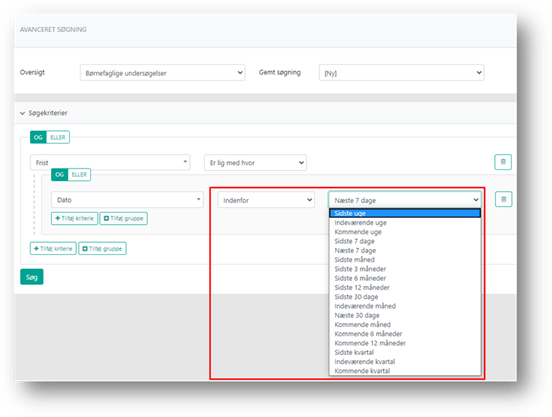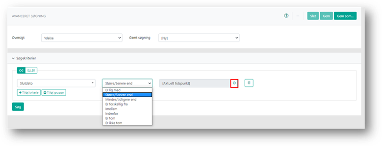 Hvis du tilføjer et søgekriterie relateret til en dato, fx Startdato eller Frist, er det muligt at lave en dynamisk søgning relateret til aktuelt tidspunkt for søgningens gennemførelse. Du kan indsætte Aktuelt tidspunkt ved at klikke på ur ikonet ved siden af datofeltet. På den måde vil søgningen altid vise resultatet for ’nu’.