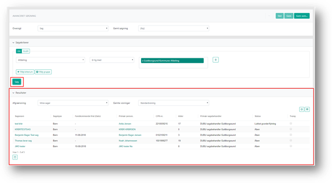 Når du har udfyldt de ønskede søgekriterier, gennemfører du søgningen ved at klikke på Søg knappen under kriterierne. Hvorefter systemet viser resultatet af søgningen i en ny fane.