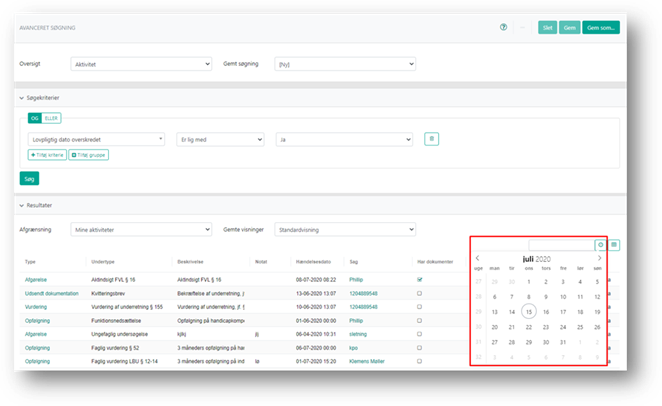Under fanen Resultater, kan du foretage en historisk søgning, når søgningen indeholder kriterier relateret til sagsoplysninger eller aktiviteter. Hvis en historisk søgning er mulig, kan du klikke på ur-ikonet og vælge hvilken dato, som du ønsker at se søgeresultatet for.