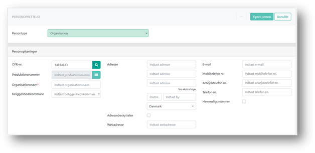 vælge persontypen Organisation, og herefter udfylde de relevante oplysninger om