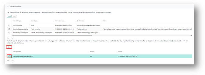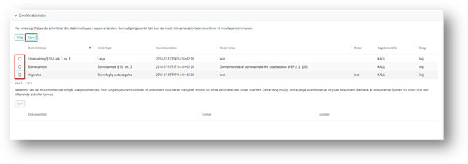 Det er muligt at fravælge dokumenter fra denne liste, hvis de ikke er relevante for sagen og derfor ikke skal overføres. Dette gøres ved at markere de enkelte dokumenter i listen og klikke på knappen fjern.