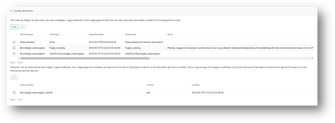 • En liste med de aktiviteter der er overført, hvor aktiviteternes type, undertype, hændelsesdato og beskrivelse fremgår.