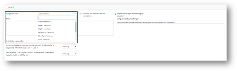Du skal vælge, hvilken kommune sagen skal overføres til. Dette gøres ved at klikke i feltet Vælg Kommune og indtast kommunenavn.