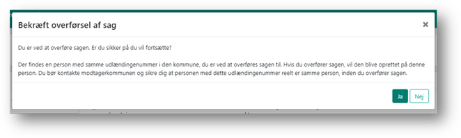 Hvis der i modtagerkommunen er en person med samme Udlændingenummer, vil du få besked om dette og skal bekræfte overførelsen.