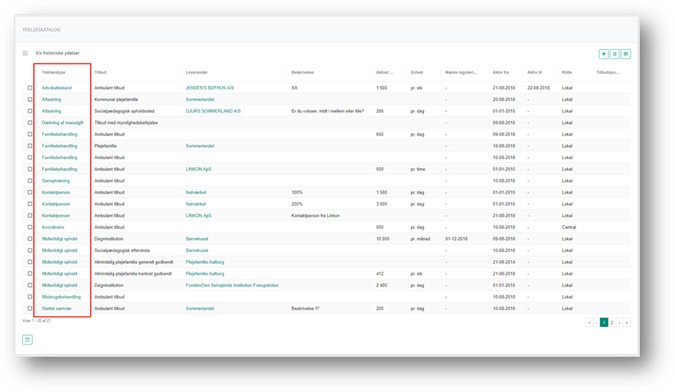 Ved at klikke på linket i kolonnen Ydelsestype åbner systemet ydelsens detaljeside. Herfra kan du, såfremt der er tale om en lokal tilbudt ydelse, redigere nogle af de oplysninger der er registreret om den tilbudte ydelse. Du kan læse mere om redigering af tilbudte ydelser i afsnittet Rediger tilbudt ydelse.